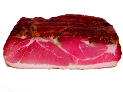 Geräucherter Schweineschinken, fein durchwachsen und durch würzen von Wacholderbeeren und Pfeffer, besonders intensiv im Geschmack.
